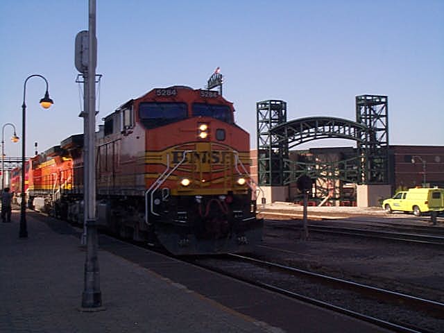 やって来たのは、BNSFのZ-TRAINでした。背後から何やら無線の音が聞こえるので、振り向くとそこには鉄道無線を聞いている親子のアメ鉄FANでした。 |