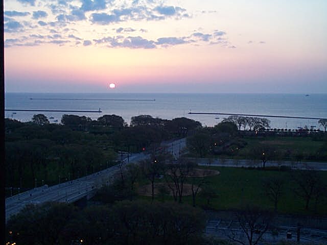 グリーン−ベイから再びシカゴ空港に降り立ち、ブルーラインで市内に、そのままユニオン駅からメトラでジョリエットまで直行するはずが、土曜日はラサールST駅からしか出ないといわれ、一旦ホテルに行くことに変更してチェックイン。ホテルからはミシガン湖がよく見えました。 |